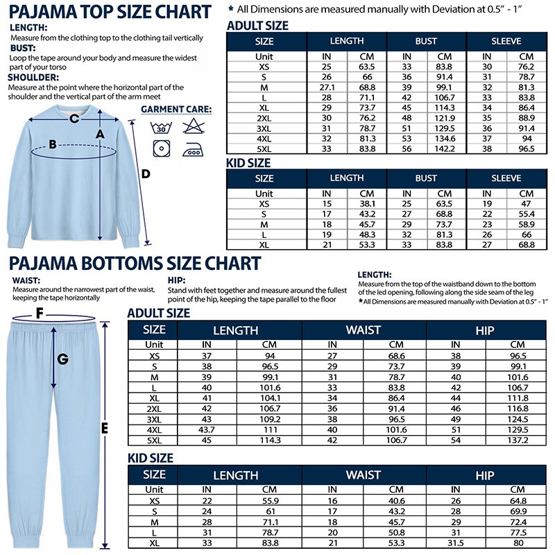 • Tips for Adults Sizes: These pajamas set for an adult is unisex form, please choose the right size for women and men. For men’s pajama set, for a comfortable fit, please choose one or two sizes up.
