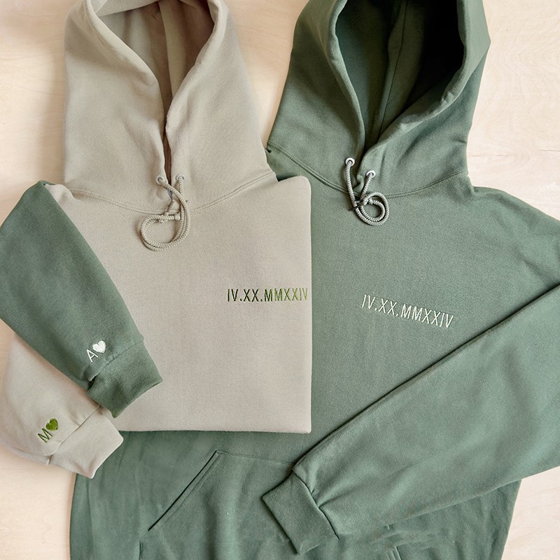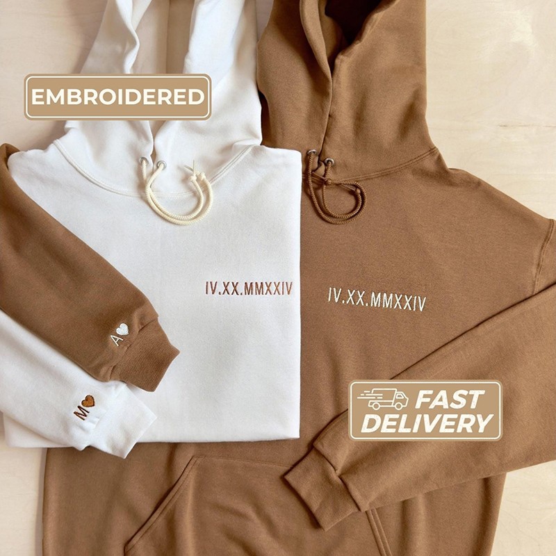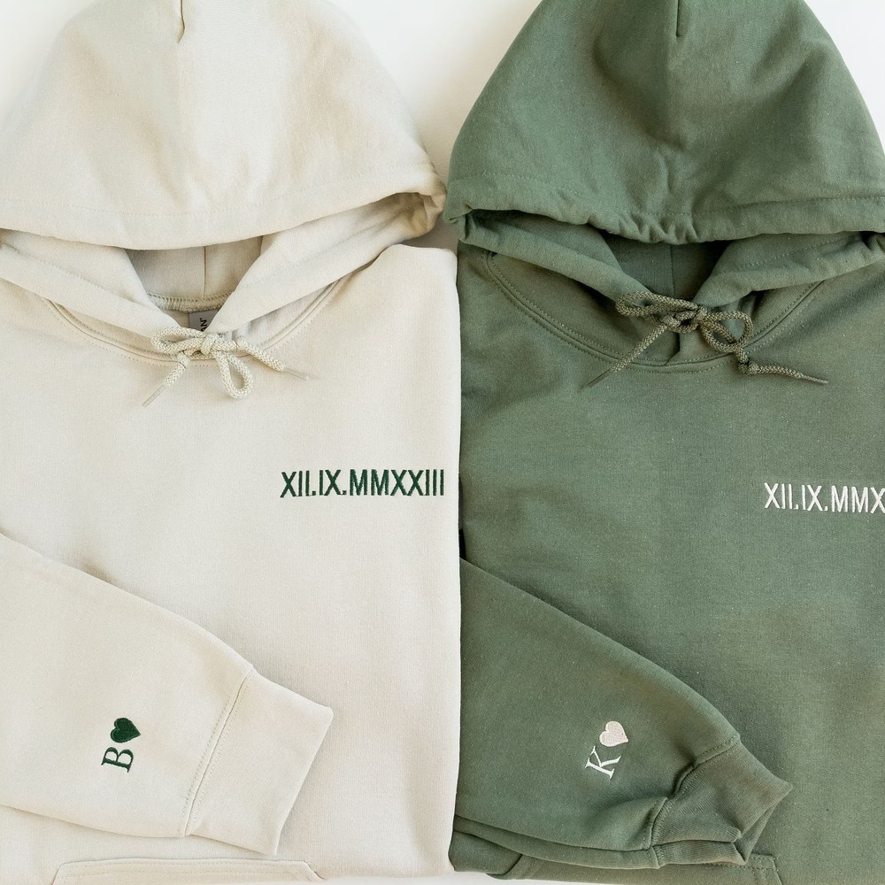 Personalized Embroidered Roman Numeral Hoodie Couples Gift Date Hoodie Initial on Sleeve Engagements 1st Anniversary Gift